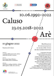Venerdì 10 giugno a partire dalle 10, nel piazzale antistante la stazione ferroviaria di Caluso, è in programma una cerimonia in ricordo delle vittime dell’incidente del 10 giugno 1992, in cui persero la vita il macchinista Mauro Guscelli e altri cinque viaggiatori. La cerimonia, organizzata dall’Associazione Nazionale Ferrovieri del Genio in collaborazione con il Comune di Caluso, la Regione Piemonte, la Città metropolitana di Torino e l’Istituto Piero Martinetti, commemorerà anche il quarto anniversario dell’incidente ferroviario al passaggio a livello di Aré, in cui morirono il macchinista Roberto Madau e l’accompagnatore del trasporto eccezionale che rimase incastrato sui binari.