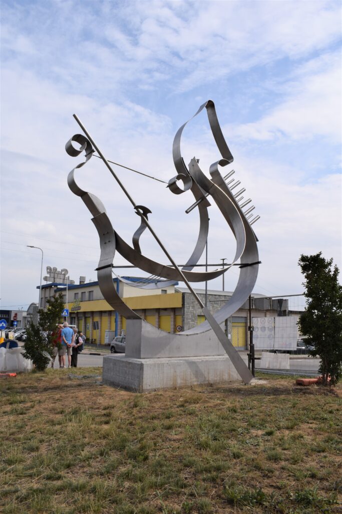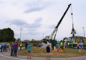 E’ finalmente sulla sua base di cemento armato, al centro della rotonda di Borgo Venezia, la Gondola dei Veneti: l’ha montata oggi la carpenteria di Antonio Sidari, che ha realizzato il manufatto (alto 6 metri e largo 4, il remo è lungo 5 metri) su disegno dell’artista chierese Leonardo Guerrino Zago e con la direzione lavori dell’ingegner Angelo Rubatto. Una tonnellata di acciaio (1100 chili!) che sintetizza il “Sogno” dei tanti Veneti giunti a Chieri dagli anni Cinquanta in poi, integratisi poi con la realtà del Chierese. Nei prossimi giorni le finiture, poi (data non ancora nota) l’inaugurazione. (Servizio fotografico di Roberto Zanchettin).