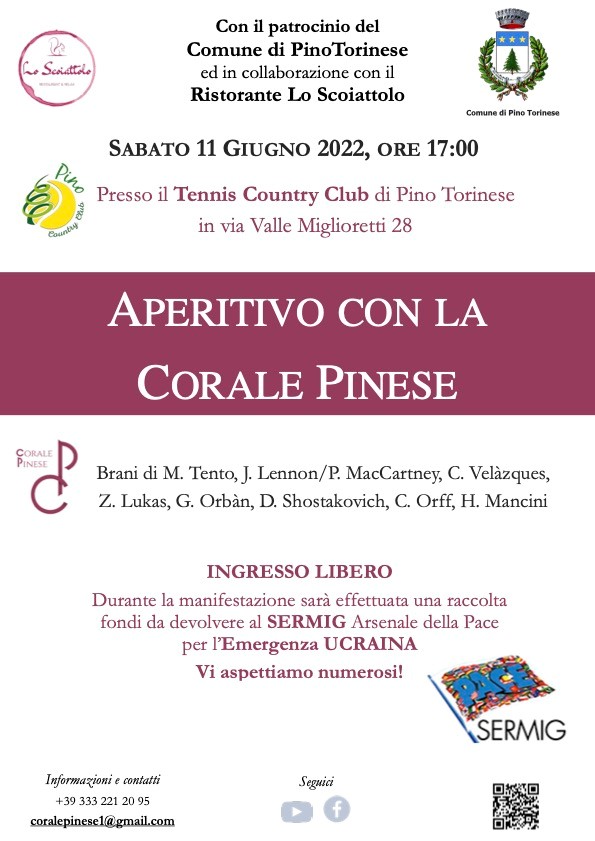 Una bella occasione per ascoltare la Corale Pinese diretta dal maestro Mario Tento e di vivere un momento di convivialità nella splendida cornice del Tennis Club di Pino Torinese. Le informazioni di dettaglio nella locandina.