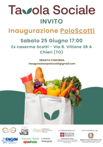 Sabato 25 Giugno alle ore 17,00 presso l’ex caserma Scotti, via B. Vittone 38 A, Chieri (TO) si terrà l’inaugurazione del Polo Scotti, che ospiterà l’Emporio Solidale, ultimo tassello del progetto Tavola Sociale. Il progetto ha l’obiettivo di promuovere un’agricoltura sostenibile, fornire un’educazione ambientale e alimentare di qualità, sostenendo e formando le persone in condizioni di fragilità, attraverso la conoscenza e la valorizzazione delle risorse alimentari e del territorio e assicurando il diritto al cibo.