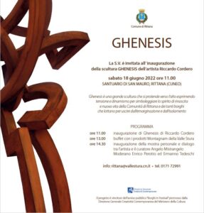 Ghenesis è una grande scultura in acciaio corten, dalla composizione caratterizzata da elementi verticali che proiettano verso l’alto un intreccio complesso di forme circolari. Un insieme molto armonico che esprime tensione e dinamismo, quello spirito di rinascita e nuova vita che intende simbolicamente rappresentare. Non casuale è anche stata la scelta della collocazione a fianco del Santuario di San Mauro, luogo emblematico dove si incontrano e sostano i residenti, dove da sempre si discutono le sorti comuni e dove si incrociano e fondono i valori civili e religiosi della comunità, che ha proprio in San Mauro il suo Patrono. L’intervento è stato voluto dalla Amministrazione Comunale assieme a MUDRI (Museo Diffuso di Rittana) e alle associazioni l’era granda e grandArte, nasce come residenza artistica all’interno della rassegna Borghi in Festival, ed è il risultato, andato ben oltre le attese, dell’incontro tra un paese e un artista che è entrato in profonda sintonia non solo con quella che è la realtà locale ma soprattutto con ciò che essa vuole essere e vuole diventare: una comunità che non si vuole arrendere a un declino che sembrerebbe irreversibile, che crede nella propria identità e in un futuro possibile, che si vuol porre come laboratorio, luogo di riflessione e sperimentazione e modello di un nuovo tipo di sviluppo. In contemporanea con l’inaugurazione di Ghenesis, Rittana ospita una mostra dedicata a Riccardo Cordero nel proprio Centro Incontri. Una selezione di sculture in bronzo, acciaio inox e opere su carta che consentono al pubblico di conoscere a fondo il linguaggio e la ricerca all’interno della quale l’artista si muove. La mostra fa parte della rassegna provinciale grandArte 2022 – help – humanity, ecology, liberty, politics,. Un grande impegno collettivo che chiama l’arte a riflettere sulle pressanti problematiche che il mondo contemporaneo deve affrontare: il cambiamento climatico e lo sfruttamento dell’ambiente; i conflitti, la violenza umana e le migrazioni; la fame, la povertà e la distribuzione delle risorse; le pandemie e i diritti umani. I temi proposti da Rittana sono quelli legati alla trasformazione del vasto territorio alpino che continua a registrare un tragico declino del proprio tessuto sociale, culturale ed economico, con conseguenti pesanti ripercussioni sull’equilibrio dell’intero Paese, ma la visuale con cui li si vuole osservare è tuttavia quella della positività e della fiducia, sulla traccia di ormai tante esperienze che scommettono sulle possibilità di reali inversioni di tendenza