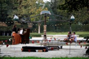 Fra uno spettacolo e l’altro, alle 17:30, 18:30 e 20:00 in piazza Cavour, l’installazione La dinamica del Controvento con la pianista Irene Michailidis. Una macchina del tempo, un sogno ad occhi aperti, un momento di sospensione, di fantasia, un gioco fragile e ipnotico alla ricerca di equilibrio e di stabilità: gli spettatori verranno trasportati dalle suadenti note di un pianoforte suonato dal vivo e cullati dal lento movimento di un tappeto che si libra a mezz’aria, ruotando senza sosta.