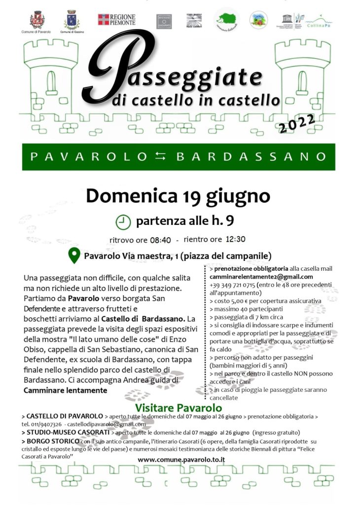 Domenica prossima, 19 giugno, la seconda data della passeggiata che collega i due castelli privati medioevali privati di Pavarolo e Bardassano, di cui si potrà vedere per l’occasione il giardino del castello oltre gli spazi espositivi della mostra di Enzo Obiso “Il lato umano delle cose” La partenza della passeggiata è alle 9 con ritrovo alle 8,45 per le iscrizioni in via Maestra 1 (piazza del Campanile) Costo: 5 euro comprensivo di accompagnamento e assicurazione responsabilità civile e infortuni.