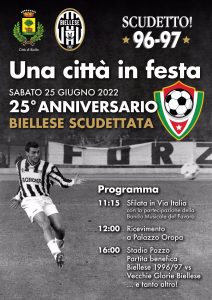 Una “Città in festa”. Il campionato 1996-97 della Biellese resterà per sempre nell’albo d’oro degli eventi sportivi cittadini. La squadra guidata da mister Roberto Bacchin conquistò prima la storica promozione tra i professionisti e a stretto giro di posta lo scudetto di categoria, nella doppia sfida con l’Astrea Roma. Per ricordare questo evento, in collaborazione con l’allora presidente del club bianconero Massimo Ghirlanda, l’amministrazione ha voluto destinare una giornata, fissata sabato 25 giugno, per onorare il prestigioso riconoscimento tricolore.