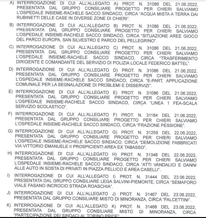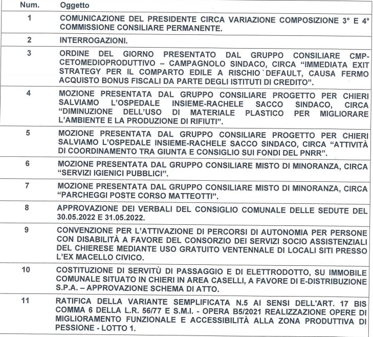 Giovedì 30 giugno alle 19 è convocato il consiglio comunale di Chieri. Qui di seguito l’ordine del giorno e l’elenco delle interrogazioni.