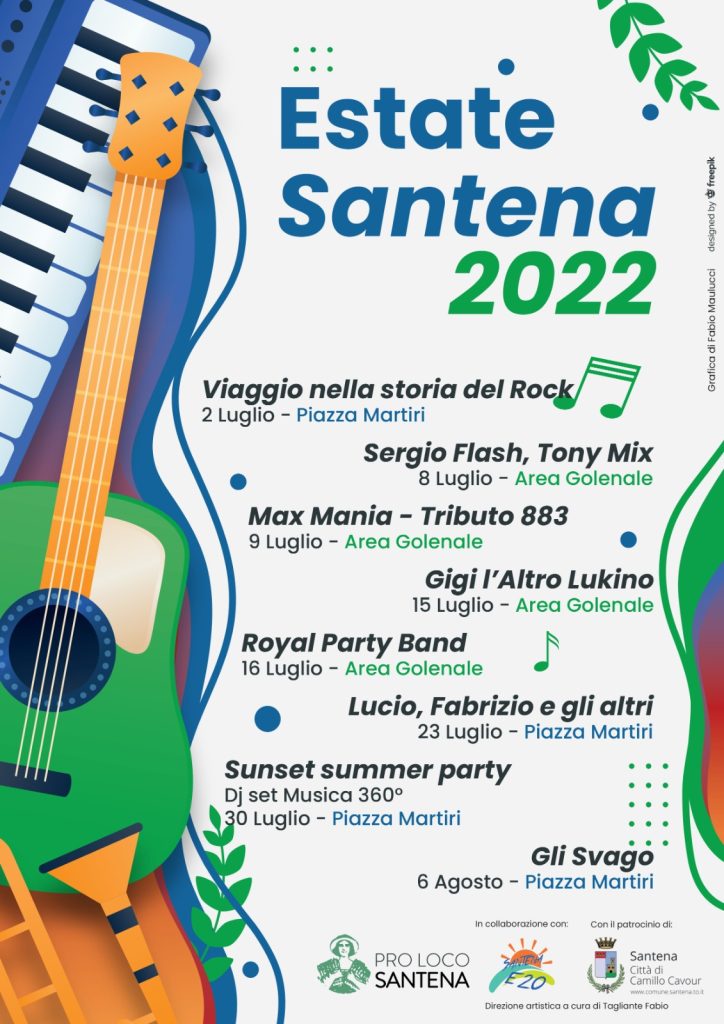 Estate santenese tra musica e sagre. Il mese di luglio Santena si anima di appuntamenti con “Estate in Santena”, un evento diffuso in tutta la città, e la “Sagra del Frispolo” presso l’Area Golenale. Queste due occasioni organizzate dalla Pro Loco Santena ed E20, serviranno per celebrare la musica e le eccellenze del territorio. Otto eventi musicali e due fine settimana di cibo e divertimento.Si inizia il 2 luglio 2022 con il “Viaggio nella storia del rock” in piazza Martiri della Libertà, l’8 e 9 luglio ci si sposta all’Area Golenale: la prima serata in compagnia di Sergio Flash e Tony Mix , mentre il 9, concerto di Max Mania, tributo agli 883. Nelle settimane successive, il 15 luglio e il 16 luglio, sempre presso l’Area Golenale, ci sarà lo spettacolo di Gigi l’Altro Lukino e il “Royal Party Band”. Si torna poi in piazza Martiri. Il 23 luglio arriveranno “Lucio, Fabrizio e gli altri”, il 30 si ballerà con il “Sunset Summer party” e infine il 6 agosto si esibiranno Gli Svago.Tutti gli ingressi agli spettacoli sono a ingresso libero, con inizio dalle ore 21,30.«I mesi estivi per Santena saranno un’occasione unica e irripetibile per vivere la nostra città anche d’estate – commenta Alessia Perrone, Assessore agli eventi e associazionismo – l’obiettivo è portare nel nostro Comune eventi sempre più di richiamo, dopo il Giro D’Italia continuiamo a lavorare per far conoscere e apprezzare le ricchezze che il nostro territorio ha da offrire attraverso manifestazioni, spettacoli e sagre». Per gli amanti delle sagre, poi, l’8, il 9, il 15 e il 16 2022 luglio, presso l’Area Golenale, si terrà la sesta edizione della Sagra del Frispolo, in cui sarà possibile assaggiare le ricette tipiche del luogo sorseggiando una buona birra artigianale.«Un plauso va agli organizzatori che sono riusciti a organizzare una bella rassegna musicale completamente gratuita per i cittadini»