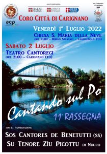 Il coro città di Carignano organizza per venerdì primo luglio nella chiesa antica di Salsasio in via Torino 191 alle ore 21 l’11esima rassegna di “Cantando sul Po” con la partecipazione dei “Sos Catores de Benetutti” e “Su Tenore Zìu Picottu” direttamente a Salsasio dalla Sardegna. La rassegna proseguirà poi il giorno successivo con il concerto al teatro Cantoregi di Carignano.Durante la serata verranno raccolte le offerte per il restauro della chiesa antica di Salsasio.