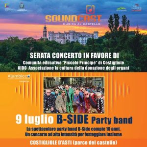 Sarà un concerto a scopo benefico quello che terrà la B-Side Party Band il 9 luglio nel parco del castello di Costigliole nell’ambito della rassegna “SoundCast”: Un’occasione per “fare del bene divertendosi” è il messaggio che l’amministrazione comunale con l’assessore alle manifestazioni e cultura Laura Bianco intende promuovere insieme al gruppo B-Side Party Band e da Alambicco Academy di Gabriele Zanon.
