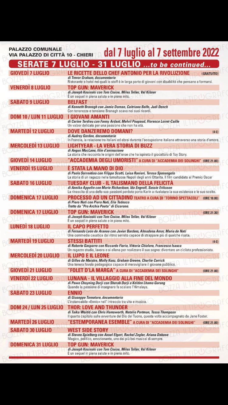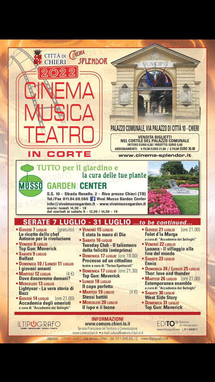 A Chieri cominciano anche le proiezioni all’aperto a cura del Cinema Splendor nel cortile del Palazzo comunale. Un fitto calendario dal 7 luglio al 7 settembre con quattro serate dedicate ai concerti dell’Accademia dei Solinghi e dei Sinc Brass e due rappresentazioni teatrali a cura della Compagnia Torino Spettacoli.