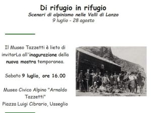 Il Museo Tazzetti presenta la nuova mostra temporanea. La mostra riguarda il tema dei rifugi e dell’alpinismo nelle Valli di Lanzo ed è allestita in due sedi: a Usseglio è sviluppato l’argomento dell’alpinismo generale, con uno sguardo particolare sul mondo dell’alpinismo femminile e sulla presenza dei Savoia, mentre nella sede di Lemie (inaugurazione 23 luglio) il tema è raccontato attraverso la storia dei numerosi rifugi e bivacchi delle tre Valli. L’arco temporale considerato va dagli albori nella seconda metà dell’Ottocento agli anni Quaranta del secolo scorso; perché quello che è avvenuto dopo la Seconda guerra è tutta un’altra storia, per le diverse modalità di approccio con l’alta montagna garantite dalle nuove attrezzature e per la facilità di trasporto nel raggiungere le basi delle vette. La storia più recente sarà comunque proposta al pubblico tramite incontri con i protagonisti dei nostri giorni, organizzati dal Museo durante l’estate.