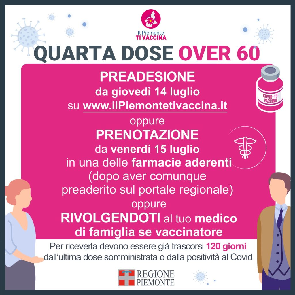 Quarta dose anti Covid-19. Accesso diretto previa preadesione sulla piattaforma “www.ilPiemontretivaccina.it”  per gli over 60 e soggetti fragili