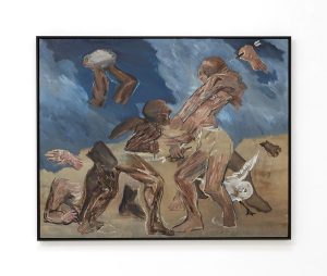 In Fall (2022), uno stormo di cinque cigni si arrampica su una rupe scoscesa legato insieme con una corda stretta al collo. Questa possente composizione diagonale è ambientata in un paesaggio surreale al crepuscolo con un cielo blu notte intenso, che ne amplifica le tensioni drammatiche. Li incontriamo quando uno di essi è scivolato sulle rocce ripide, trascinando gli altri verso il basso con corpi e ali che si agitano in preda al panico. È come se questi uccelli avessero dimenticato di poter volare e invece fossero bloccati a terra, fissando il loro tragico destino. La narrazione sembra una favola familiare, che descrive un racconto ammonitore sul rischio di fidarsi delle persone sbagliate e su come questo può condurre alla morte. Mentre qui i cigni alludono alle persone, altrove simboleggiare le armi. Tale simbolo intercambiabile è per l’artista una prova su come, nella nostra esistenza, l’ansia e il sospetto possono trasformare chiunque in armi percepite contro di noi.