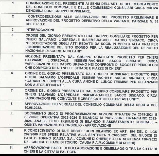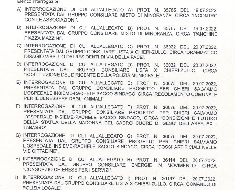 Convocato per mercoledì 27 e giovedì 28 luglio l’ultimo consiglio comunale di Chieri prima delle vacanze.