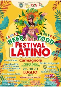 Dal 29 al 30 luglio si svolge a Carmagnola il Beer Food Festival Latino, organizzato da D&N Eventi srl, con il patrocinio del Comune di Carmagnola e in collaborazione con Chef dal Mondo e Creativamente. Il Festival si svolge nella grande area di Piazza Italia, con ingresso gratuito da via Gobetti, venerdì dalle ore 18 alle ore 24, sabato e domenica dalle ore 10 alle ore 24. Un cocktail divertente e frizzante tra buona cucina, buon bere e tanti momenti di spettacolo dal ritmo sudamericano, un vero e proprio ponte tra i due mondi in una proposta varia e rivolta a tutti. Si inizia il venerdì con DJ e Schiuma Party, dedicato ai più giovani. Aperitivo per il sabato quando ci saranno scuole di ballo, samba e seggae con i Timbales, artisti latini e, a seguire, ancora musica e DJ. Infine la domenica carmagnolese sarà animata dal eeggaeton dei Bandyta e dalla partecipazione di scuole di ballo con ballerine e ballerini professionisti.