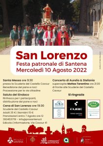Santena si veste a festa per le celebrazioni del Santo Patrono. Mercoledì 10 agosto in occasione di San Lorenzo, patrono della Città, sono previsti eventi per tutta la giornata, organizzati dalla Proloco Santena in collaborazione con la Fondazione Cavour, il centro Anziani, la Parrocchia e il patrocino della Città di Santena. Si inizia alle 9:30 con la Santa Messa presso le Scuderie del castello Cavour con la benedizione del pane e noci, per poi passare alla processione per le vie cittadine. A seguire il Saluto del Sindaco Roberto Ghio con un rinfresco per tutti i partecipanti e la distribuzione del pane e delle noci.«La Festa Patronale di San Lorenzo è una celebrazione molto sentita e una bella occasione per tutti i cittadini, l’Amministrazione e le associazioni. E’ un momento di condivisione, che rappresenta un forte senso di comunità e tradizione – commenta Alessia Perrone assessore al turismo e manifestazioni del Comune di Santena – Ogni anno l’affluenza è sempre alta ed è l’occasione per tramandare una tradizione di decenni caratterizzata dalla distribuzione del pane alle noci preparato dai fornai della città, dando una valore anche ai prodotti tipici del nostro territorio».Alla sera le celebrazioni continueranno alle 19:30 con la Cena di San Lorenzo, all’interno delle Scuderie del Castello Cavour. Il costo della cena è di 25 € per gli adulti e 15€ per i bambini.Il menu della cena comprende tre antipasti: Battuta di Fassone, insalata di robiola con sedano, noci e miele, vitello tonnato. Come prima portata il risotto di mele con salsiccia di bra duro, mentre il secondo prevede Lonza alle nocciole accompagnato da patate al forno e padellate di verdure miste, per finire il dolce con macedonia con gelato. Tutto accompagnato da vini Barbera e Chardonnay.È possibile prenotarsi  presso l’edicola L’informazione (via Cavour 41 – Santena), al numero 3924531719 o via mail a prolocosantena@gmail.com, entro e non oltre il 7 agosto 2022. La notte delle stelle cadenti verrà animata da Matteo Tarantino con Aurelio & Stefania.