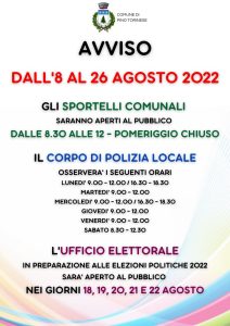 L’ufficio elettorale, in preparazione alle Elezioni Politiche 2022, sarà aperto al pubblico nei giorni 18, 19, 20, 21 e 22 agosto