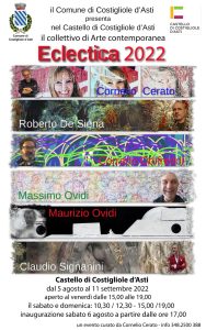 Pochi castelli sono eclettici come quello di Costigliole, diviso tra due stili architettonici, corrispondenti ai due antichi proprietari. Proprio al castello vi aspetta una bella mostra d’arte contemporanea che, non a caso, intitolata “Eclectica 2022”. Mostra aperta nei giorni: venerdì 15-19; sabato e domenica 10.30-12.30 e 15-19. Farsi un giro a Costigliole è sempre un piacere, al suo castello e alle esposizioni che ospita ancora di più. Mostra con le opere di numerosi artisti, visitabile fino all’11 settembre: un progetto realizzato dal Comune, in collaborazione con il collettivo di Arte contemporanea. Sono esposte opere degli artisti prettamente cuneesi: Cornelio Cerato, Roberto De Siena, Corrado Odifreddi, Massimo Ovidi, Maurizio Ovidi, Claudio Signanini. L’evento è curato da Cornelio Cerato. Per informazioni: 348-2500388. Fotografo. La sua attività professionale si accompagna, soprattutto negli ultimi anni, ad una sempre più importante attività artistica. Collabora da tempo con l’Associazione Artistica Culturale MAGAU e con il Club Unesco di Alba, anche in veste di organizzatore e curatore di eventi artistici, legati alle attività del Club sul territorio. Invece l’attività di Roberto De Siena inizia negli anni ‘80 con la lavorazione del vetro: restauro di vetrate antiche, vetrofusione, incisione. In quegli anni fonda la “Lavorazioni artistiche”, punto di ritrovo di pittori, scultori, architetti, musicisti. Ha partecipato e partecipa ad eventi espositivi anche all’estero. Corrado Odifreddi opera come decoratore d’interni e restauratore, affiancando all’attività lavorativa una costante produzione di opere pittoriche e grafiche. Massimo Ovidi ha sempre avuto una passione per il disegno e la pittura. Ha partecipato a numerose mostre collettive, oltre che ad alcune personali. Il suo stile risulta essere una combinazione di figurativo e astratto, in cui gli elementi naturali e quelli geometrici si compenetrano, si sovrappongono o si confondono tra di loro. Maurizio Ovidi svolge il lavoro di coordinatore di progetti a carattere educativo e di reinserimento sociale di persone svantaggiate e in parallelo è impegnato nell’attività artistica. Nel 1983 ha tenuto la sua prima personale alla Galleria Giancarlo Salzano di Torino. Oltre alla partecipazione a eventi Claudio Signanini lavora in qualità di Creative Designer. Si è diplomato presso il Liceo Artistico di Cuneo e ha conseguito il diploma di licenza di Pittura presso l’Accademia delle Belle Arti di Torino. Ha esposto in mostre personali e collettive dal 1987 ad oggi.