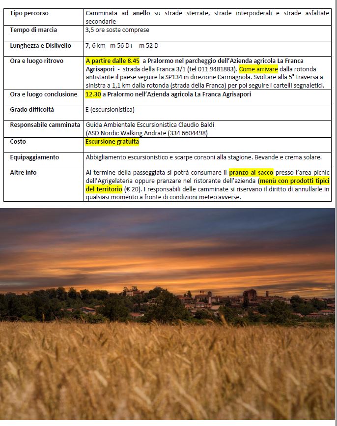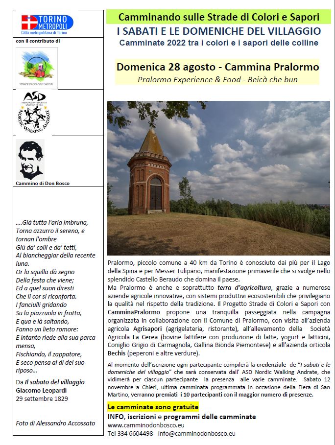 Il “Cammino di Don Bosco”, itinerario escursionistico ideato e progettato dal Tavolo tecnico del progetto “Strade di Colori e Sapori” e realizzato dall’associazione sportiva dilettantistica Nordic Walking Andrate, propone, a partire da domenica 28 agosto fino a sabato 13 novembre, «I SABATI E LE DOMENICHE DEL VILLAGGIO», ovvero tredici camminate gratuite, organizzate in concomitanza di una fiera, di una sagra o di un evento culturale o enogastronomico, con protagonisti i 13 Comuni della collina torinese aderenti alle “Strade di Colori e Sapori”.