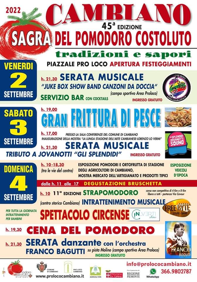 Sagre – Feste – Manifestazioni a : Chatillon, Vezzolano, Castelnuovo Don Bosco, Gassino Torinese, Valfenera (AT), Cuorgnè, Quincinetto, Montechiaro d’Asti.
