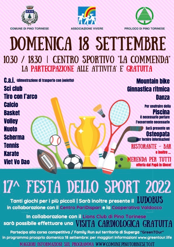Torna la giornata dedicata allo Sport a Pino Torinese: ideata dall’Associazione Vivere e realizzata dal Comune di Pino in collaborazione con le associazioni sportive pinesi e la Consulta delle Associazioni, la Festa dello Sport giunge alla sua diciassettesima edizione.
