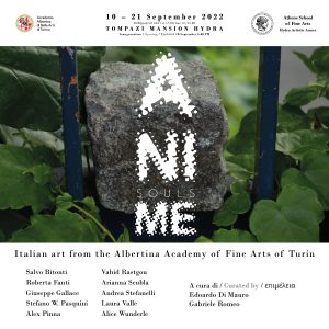 Grazie alla fitta rete di relazione imbastite negli anni dal Vice Direttore per l’Internalizzazione Salvo Bitonti, inventore del FISAD Festival Internazionale delle Scuole d’Arte e Design, a sua volta l’Accademia di Torino presenta ora negli spazi espositivi di una pregevole sede ottocentesca distaccata dell’ASFA nell’isola di Hydra, la “Tompazi mansion”,la mostra “Anime”, con opere di ricerca di alcuni giovani talenti dell’Accademia a confronto con docenti affermati, a cura del Prof. Gabriele Romeo e del Direttore dell’Accademia Albertina Edoardo Di Mauro.