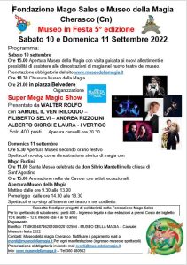 Il Museo della magia in collaborazione con la Fondazione Mago Sales nel secondo weekend di settembre organizza la 5° edizione di “Museo in festa” con un programma naturalmente magico e di alto livello artistico. Mattatore della manifestazione sarà Walter Rolfo con il suo gruppo “Masters of Magic”, una organizzazione che nei prossimi anni allestirà a Torino i campionati europei della magia (2024) e subito dopo quelli mondiali (2025). Grandissime manifestazioni che ospiteranno centinaia di migliaia di maghi e di visitatori provenienti da tutto il mondo. Naturalmente la stampa sta dando il giusto risalto a queste manifestazioni. Il museo della magia sarà direttamente collegato a questi eventi internazionali e Cherasco si sta preparando a ricevere migliaia di visitatori che riproporranno Cherasco insieme a Torino Capitale Mondiale della Magia. Lo stesso Valter Rolfo sarà il prossimo dirigente del Museo della Magia di Cherasco, sostituendo degnamente don Silvio, mago Sales, alla direzione del museo. Se siete curiosi e non avete chiuso completamente le finestre ai sogni venite a Cherasco il 10 e l’11 settembre per immergervi in mondo irreale, ma pur sempre possibile. Tutti noi, in questo periodo di incertezze, abbiamo bisogno credere ai sogni perché, così, basta un gradino per raggiungere le stelle”. Walter Rolfo presenterà il galà internazionale di Magia la sera del sabato 10 settembre nella piazza Belvedere a Cherasco. Uno spettacolo senz’altro all’altezza di ogni aspettativa in cui saranno protagonisti premi mondiali di magia nel recente congresso a Québec City. Inoltre, domenica. i visitatori del museo della magia potranno assistere alle nuove animazioni e allestimenti. Tutti voi sarete accompagnati dalla voce di Arturo Brachetti che vi porterà a vivere emozioni straordinarie con il racconto dei più grandi maghi della storia.