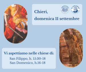 A Chieri ritorna, dopo la pausa estiva, la rassegna di “Monumenti Aperti”: per scoprire i luoghi piùsuggestivi della nostra città, a cura dei volontari dell’associazione culturale di Carreum Potentia. Viaspettiamo domenica 11 settembre con le chiese di San Filippo, dalle ore 15.30 alle 18, e San Domenico, dalle 16 alle 18. L’evento è gratuito, per ulteriori informazioni chiamare al numero 333-1186114. Il prossimo appuntamento si terrà domenica 18 settembre con la Giornata Europea dellaCultura Ebraica, per ulteriori informazioni e per il calendario delle prossime attività consultare i lsito www.carreumpotentia.it