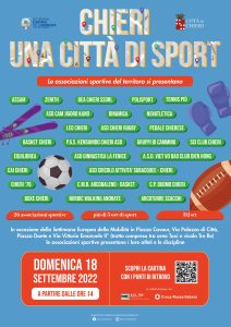 Domenica 18 settembre la Città di Chieri organizza «UNA CITTÀ DI SPORT», un evento che dalle ore 14.00 alle 19.00 vede protagoniste nel centro storico le associazioni sportive del territorio. Nelle vie e nelle piazze cittadine (via Vittorio Emanuele, nel tratto compreso tra area taxi e vicolo Tre Re, via Palazzo di Città, piazza Cavour e piazza Dante) saranno presenti gazebo e banchetti informativi di 26 associazioni sportive, che presenteranno le loro attività e i loro atleti con dimostrazioni sportive e prove gratuite, al fine di promuovere iniziative che favoriscano il buon vivere e il benessere e di dare a tutti, in particolare ai giovani, la possibilità di avvicinare e conoscere meglio una disciplina sportiva.