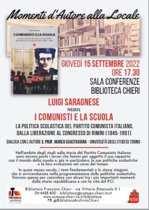 Il prossimo appuntamento di Momenti d’Autore alla Locale è giovedì 15 settembre nella Sala Conferenze della Biblioteca alle ore 17.30. Luigi Saragnese presenterà il libro I comunisti e la scuola.