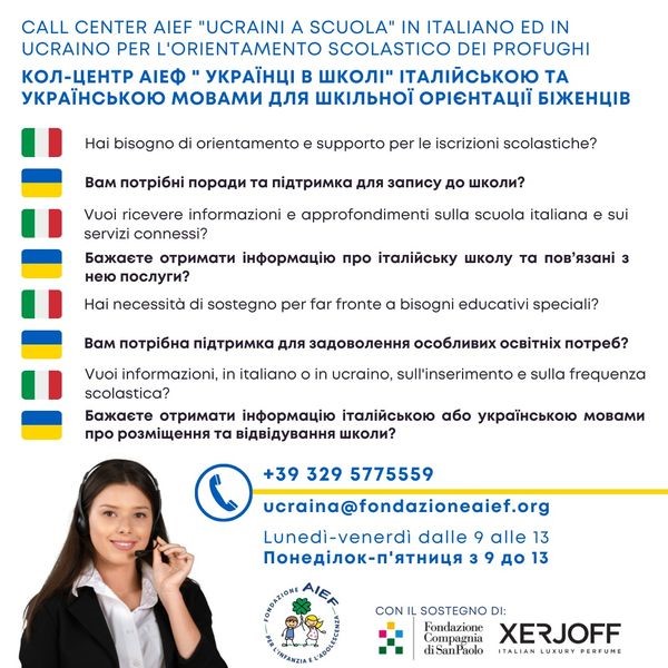 La Fondazione AIEF, con il sostegno di Compagnia di San Paolo e Xerjoff Group, offre, fino alla fine di settembre, il primo CALL CENTER AIEF specializzato all’orientamento scolastico per i profughi ucraini in età scolare.