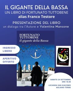 Incontro con l’autore Franco Testore celato dietro lo pseudonimo di Fortunato Tuttobene già primario di oncologia nel nosocomio cittadino, ora presente nel volontariato sociale, intervistato dalla giornalista di casa Valentina Mansone per la presentazione del romanzo ‘Il gigante della bassa’”, pubblicato da Ibuc Edizioni.Sabato 24 Settembre alle ore 18.00 presso la Locanda San Giacomo in Piazza Roma. Al termine sarà offerto un aperitivo a tutti i presenti. La partecipazione è gratuita. Il dott. Testore apprezzato autore di volumi ispirati alle storie di gente della terra, Incomincia a raccontare le sue storie nel 2005 , dopo aver ascoltato per molti anni quelle dei suoi pazienti.. “Il gigante della Bassa”, è il suo terzo romanzo e l’autore ambienta la storia  nella campagna emiliana della prima metà del ‘900  ed una riuscita ricostruzione del profilo di una società contadina al bivio tra le sue profonde radici ancorate nel lavoro della terra e la nuova esaltazione di uno Stato moderno. Una storia di gente semplice, che ha come protagonista la vita di Ermete, un mezzadro troppo loquace, conun temperamento da leader, antifascista nell’anima, amante della bicicletta e della sua Adalgisa, che si divide tra il campo da coltivare e il bar del paese. E’ nata così una lunga saga familiare che copre un secolo di storia d’Italia e ci porta a conoscere il mondo dei mezzadri, le loro condizioni di vita, la fatica, le due guerre mondiali. L’autore darà vita alle pagine di rara profondità e delicatezza di questo libro  che sa “di vita vera”, che ci porta attraverso la vita e la morte, la pace e le guerre.    Ben presto Ermete si scontra con la nuova realtà, rappresentata dal Partito Fascista. Ermete è la rappresentazione più vera della dura vita dei mezzadri. Il romanzo è piacevole e scorrevole nella lettura, ci riporta indietro nel tempo per poter comprendere la vita grama dei nostri avi.  Solo chi è fortemente legato alla sua terra, ai suoi “vecchi” e alle loro storie, poteva dar vita ad un personaggio come Ermete, che volente o nolente si ritrova ad affrontare i vari eventi della prima metà del 900, dalla Grande Guerra                                                 all’ arrivo del Fascismo.  Attraverso le difficoltà e le gioie del protagonista, l’autore riesce abilmente a raccontare non solo la persona stessa, ma anche tutto il suo ambiente circostante, permettendo al lettore di immergersi in un mondo oggi forse un po’ dimenticato, ma che allo stesso tempo riserva ancora insegnamenti che vanno oltre lo scorrere del tempo. Quindi se volete conoscere meglio Ermete e la sua storia, non potete mancare l’appuntamento, al quale seguirà un piccolo aperitivo offerto dalla Locanda San Giacomo, per concludere l’incontro con un momento di convivialità, condito dai vini dei produttori di Agliano Terme.