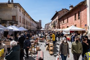 Domenica 2 ottobre 2022 l’antiquariato torna ad vivacizzare il centro di Cherasco. Centinaia di espositori con i loro banchi saranno sparpagliati per le vie ortogonali in un cornice caratterizzata da palazzi barocchi, chiese seicentesche e torri medievali a delimitare i bellissimi vicoli di questa cittadina insieme ai due archi monumentali che disegnano il salotto cittadino, la via principale, via Vittorio Emanuele II. Si respirerà atmosfera d’antan: sulle bancarelle si troveranno mobili, suppellettili, libri e stampe, strumenti da lavoro, stoffe, abiti, dischi, vintage e retrò. Al mercato dell’antiquariato cheraschese si trova un po’ di tutto: è come un viaggio nella memoria con le stoviglie e gli oggetti simili a quelli che abbiamo visto a casa della nonna, ma ci sono anche pezzi preziosi e insoliti. Il centro storico sarà chiuso al traffico veicolare dalle 7 alle 18. Venire a Cherasco la domenica del mercatino è anche l’occasione per stare all’aria aperta: passeggiando tra i banchi nelle vie, fermandosi nei déhors esterni per mangiare, camminando lungo i viali napoleonici e i bastioni da cui si gode il panorama sulla Langa, qui vi aspetta l’installazione temporanea dedicata al bacio per una foto e una menzione sui social (#baciamiacherasco). Un’occasione da non perdere essendo il penultimo mercatino, quello successivo sarà infatti in piena stagione fredda domenica 4 dicembre. Nella Chiesa di San Gregorio si potrà visitare la mostra ad ingresso libero di Vesna Bursich “White noise”, aperta fino al 16 ottobre 2022. Per gli amanti dell’enogastronomia Cherasco inoltre offre una vasta gamma di eccellenze artigiane: dalle chiocciole cucinate nei modi più svariati nei ristoranti cittadini alla Salsiccia di Cherasco al Barolo ai dolci Baci, perfetto connubio tra nocciola di Langa e cacao, oppure la Robiola di Cherasco, eccezionale formaggio di capra che ha ottenuto la certificazione De.Co, riconoscimento comunale che garantisce la genuinità e la filiera del prodotto. Inoltre la Città delle paci, con la sua storia, l’arte, la cultura è anche uno degli 11 Comuni del Barolo.
