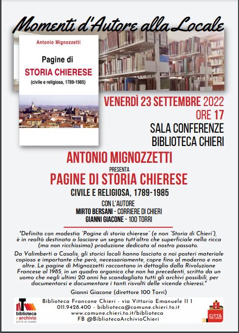 A Chieri, appuntamento di Momenti d’Autore alla Locale. Venerdì 23 settembre nella Sala Conferenze della Biblioteca, ma alle ore 17, Antonio Mignozzetti presenterà il libro Pagine di storia chierese (civile e religiosa,1789-1985).L’Autore dialogherà con Mirto Bersani e Gianni Giacone.