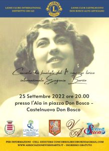Dal 23 al 25 settembre 2022 si terrà nella chiesa di Santa Croce a Poirino la prima edizione del concorso internazionale di canto lirico dedicato a “Eugenia Burzio“, soprano poirinese. Il concerto dei finalisti si terrà alle ore 20 a Castelnuovo Don Bosco (AT), nell’Ala in piazza Don Bosco.