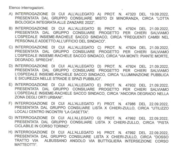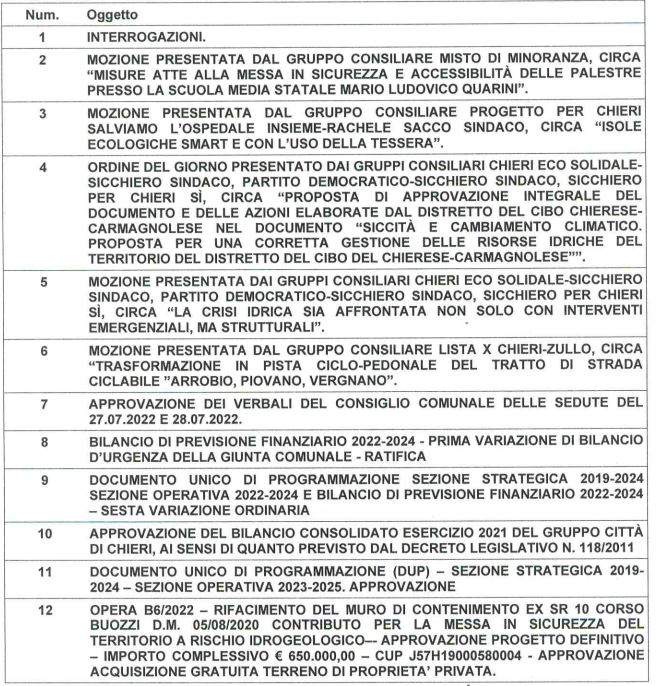 E’ convocato il consiglio comunale di Chieri per giovedì 29 e venerdì 30 settembre. Questo l’ordine del giorno.