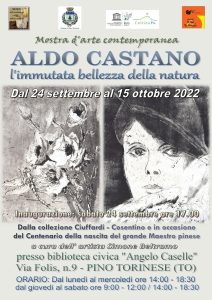 Quest’anno ricorre il centenario della nascita di un importante pittore e incisore pinese, Aldo Castano. Maestro nella nostra scuola elementare, era anche Maestro nell’arte, pinese per scelta di cuore e di anagrafe. Verrà ricordato e celebrato con una mostra epocale, destinata a segnare il nostro tempo artistico con 147 opere messe a disposizione dai proprietari di una straordinaria collezione, i coniugi Ciuffardi – Cosentino. Fino al 15 ottobre 2022, dal lunedì al mercoledì ore 14-18,30 – dal giovedì al sabato ore 9-12 / 14-18,30. Biblioteca civica, via Folis 9, Pino Torinese. Le opere esposte sono in vendita con una particolarità: tutti i pinesi con un solo euro (non un centesimo in più) hanno l’occasione di acquisire in comproprietà una delle opere (la copa, in piemontese-incisione in bianco e nero su carta speciale con poesia in tema di Nino Costa) che sarà esposta in Sala Consiglio con i nomi dei donatori. La sottoscrizione, che deve raggiungere la cifra di 400 euro, è aperta alle scuole, ai gruppi associativi, al mondo sportivo, a tutte le aggregazioni sociali di Pino.