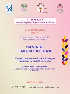 La conferenza Prevenire è meglio di curare – Alimentazione e movimento fisico per migliorare la qualità della vita si inserisce nelle iniziative di Ottobre Rosa che V.I.T.A. OdV ogni anno presenta sul territorio per sensibilizzare alla prevenzione primaria, secondaria e terziaria, ed è intesa a presentare le proposte dell’associazione e lo spazio di accoglienza per donne ammalate di cancro e loro familiari (caregiver) ospitato presso il Comune di Castelnuovo Don Bosco (AT).