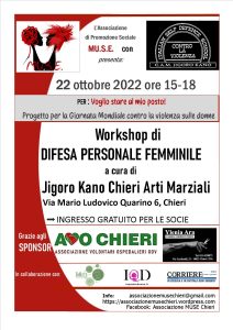 A Chieri una iniziativa dell’associazione MUSE nata nell’ambito del progetto annuale contro la violenza “Voglio stare al mio posto”, giunto ormai alla quinta edizione.Sabato 22 ottobre dalle 15 alle 18 si svolgerà un workshop di autodifesa femminile presso la palestra Jigoro Kano di Chieri, in via Quarino 6. Il programma comprende una parte teoria e una pratica.Il workshop, escluso dal bando per i contributi del Comune, viene realizzato con il contributo economico dell’AVO e di Ylenia Ara parrucchieri, sponsor ufficiali per questa parte del progetto.La partecipazione è riservata a titolo gratuito alle socie. E’ possibile tesserarsi a quota convenzionata per il workshop fino a esaurimento posti. L’attività beneficerà di apposita copertura assicurativa.Il termine per le iscrizioni è il 10 ottobre.