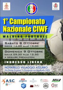 Sabato 8 Ottobre e Domenica 9 , si scenderà in campo al Centro Sportivo Novarello Villaggio Azzurro ( nei pressi di Novara) per il più grande evento organizzato in Italia in relazione al Walking Football , con la partecipazione di 17 Società che presenteranno in campo 25 squadre suddivise in: 14 nella Categoria Over 50 , 8 nella Over 60 dove si assegneranno i Titoli di Campione d’Italia CIWF , oltre a 3 squadre che si  disputeranno il Torneo Sperimentale Over 67 . Si prevede la presenza sul terreno di gioco nei due giorni della competizione di circa 230 calciatori walkers.  Nomi di spicco e Campioni d’Italia del nostro calcio professionistico saranno coinvolti tra le file delle squadre partecipanti , Domenico Volpati,  scudettato con il Verona giocherà per la squadra Over 60 del Novara WF Bulè e Alberto Marchetti, 2 titoli italiani con la Juventus come Tecnico della Sparta Novara WF , entrambi oltre che in campo, daranno il loro contributo per le premiazioni finali . Sempre coinvolto nelle premiazioni vi sarà Domenico Marocchino due volte Campione d’Italia con la Juventus e giocatore della Nazionale ed a completamento per le premiazioni saranno presenti le autorità cittadine .
