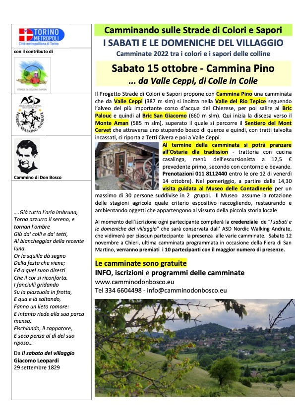 “Cammina Pino: da Valle Ceppi, di Colle in Colle” di Redazione · 13 Ottobre 2022 Passeggiata sabato 15 ottobre per il ciclo di eventi “Camminando sulle Strade di Colori e Sapori” Visto da: 268