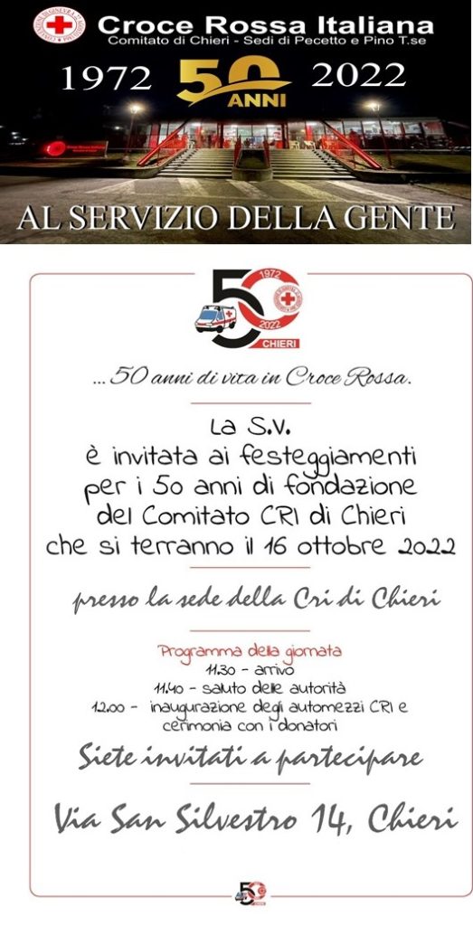 Un’occasione per ringraziare la Croce Rossa di Pino-Chieri-Pecetto per il suo servizio (e quello dei suoi volontari) per la nostra comunità cittadina: in sostanza questo rappresenta la celebrazione del 50mo di fondazione del Comitato CRI che si svolgerà domenica 16 ottobre a Chieri.