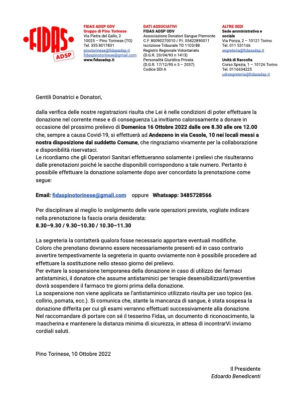 Domenica 16 ottobre è possibile effettuare la donazione del sangue grazie al Gruppo Fidas di Pino di Redazione · 15 Ottobre 2022 Visto da: 112