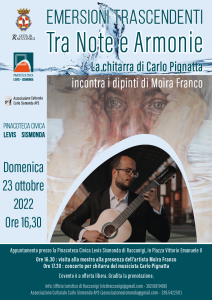 Domenica 23 ottobre, negli spazi della Pinacoteca Civica Levis Sismonda di Racconigi, in P.zza Vittorio Emanuele II, n.15 si svolgerà il primo doppio appuntamento collaterale alla Mostra Personale dell’artista Moira Franco intitolata “Emersioni trascendenti”, visitabile sino al 4 dicembre 2022. Alle ore 16.30 si terrà una visita guidata alla mostra, alla presenza dell’artista, mentre alle ore 17.30 il pubblico potrà assistere al concerto per chitarra del giovane e talentuoso musicista Carlo Pignatta, il quale offrirà una propria interpretazione musicale circa i temi affrontati visivamente in rassegna.  Il programma prevede un ricco repertorio, classico e moderno che, da Mysterious Habitats di D. Bogdanovic, passando per “Dal Decameron Negro: La Fuite des Amants par la Vallée des Èchos” di L. Brouwer e “Prelude and Waltz” di N. Koshkin, toccherà R. Dyens e N. D’Angelo, sino a offrire al pubblico alcuni brani composti da Pignatta e già pubblicati nei suoi EP “Circle”, del 2021 e “Ricordo”, uscito nel marzo del 2022. L’evento è pubblico a offerta libera – gradita la prenotazione.