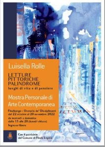 Sabato 22 ottobre alle ore 17 si inaugura, presso la Sala espositiva “Oratorio de’ Disciplinanti” di Finalborgo, la personale dell’artista Luisella Rolle. L’esposizione, presentata nel 2020 presso la Biblioteca Nazionale Universitaria di Torino, è il risultato di un progetto sviluppato dall’artista in molti anni di ricerca sul tema del mondo urbano percepito attraverso lo spostamento del punto di vista.  Intitolata Letture Pittoriche Palindrome. Luoghi di vita e di pensiero,la mostra a cura di Silvana Nota, e un intervento critico in catalogo di Angelo Mistrangelo, propone opere da leggere, con un’ottica palindroma o bifacciale, la realtà percepita in una doppia visione: la prima come impatto e la seconda invece riletta con un’ottica diversa e aperta. Il percorso di ricerca condotto dall’artista trova la sua fonte iniziale di riferimento nel palindromo di Primo Levi In arts it is repose to life / è filo teso per siti strani contenuto nel racconto “Calore vorticoso” tratto da “Lilith e altri racconti”, per tracciare, in totale libertà e indipendenza dal testo, un viaggio nella città odierna suggerita nella sua immagine da un’ottica che invita a considerare la realtà e rileggerla da un altro punto di osservazione. Il palindromo ne è il veicolo identificato in un doppio filone: nei titoli, parte integrante delle opere, e in alcune tele installative bifacciali. Torino, rivisitata in angolazioni molteplici, diviene invece lo sfondo sul quale l’artista dipana il suo tema che sfoca confini e apre orizzonti. L’itinerario espositivo si sviluppa in più sezioni, con un percorso che vede ogni area tematica collegarsi con le altre seguendo il senso compiuto del progetto, oppure vivere come un’isola a sé stante.
