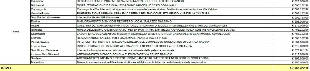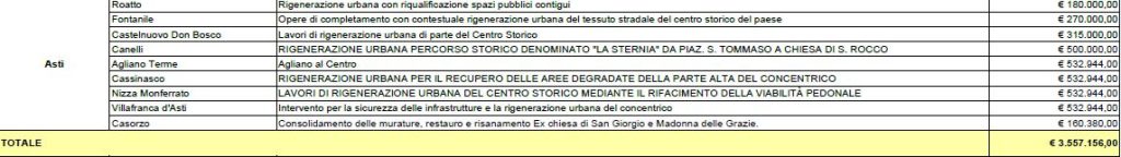 Gli interventi più significativi finanziati: Carmagnola (pavimentazione Via Valobra, 762 mila euro), Santena (adeguamento impianti nelle scuole, 495 mila euro), Marentino (riqualificazione scuola infanzia, ambulatorio e sede associazioni, 550 mila euro), Castelnuovo don Bosco (rigenerazione urbana centro storico, 315 mila euro), Nizza Monferrato (rifacimento viabilità in centro, 532 mila euro), Villafranca d’Asti (rigenerazione urbana del concentrico, 532 mila euro).