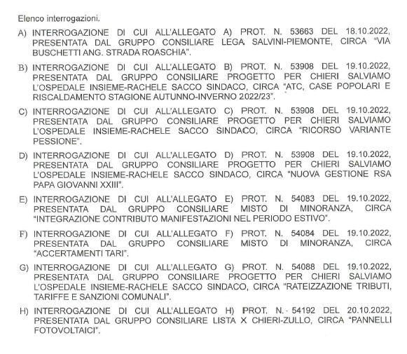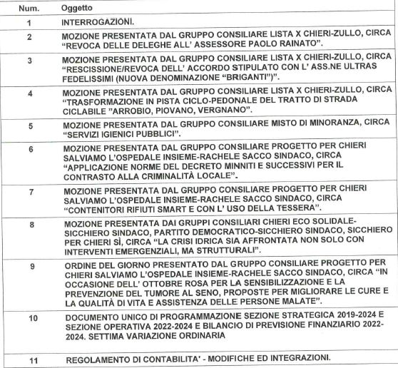 Convocato per giovedì 27 e venerdì 28 ottobre, con inizio alle 19,45, il consiglio comunale di Chieri. Ecco l’ordine del giorno.