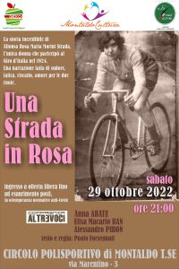 Sabato 29/10 al Circolo Polisportivo Montaldese sarà presentato lo spettacolo teatrale che racconterà in chiave simpatica e divertente le vicende di Fonsina Strada, l’unica donna che nel 1924 partecipò al Giro d’Italia. Parteciperà, assieme ai bravissimi attori della Compagnia ALTREVOCI, Paolo Forsennati, autore e regista della piece teatrale. Lo stesso spettacolo si è tenuto a Torino il 21/10/2021.