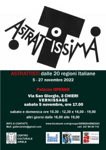 Astrattissima 2022 rappresenta un importante appuntamento che richiama selezionati artisti astrattisti da tutte le regioni italiane; in particolare, quest’anno, saremo lieti di ospitare diversi rinomati pittori piemontesi e avremo modo di offrire una ricca e articolata rassegna espositiva. Astrattissima 2022 , promossa dal Centro Culturale Ariele, è giunta alla sua terza edizione, e ci auguriamo di ripetere il successo di critica e di pubblico riscossi durante le precedenti edizione del 2017 presso l’ Ecomuseo Urbano di via San Gaetano da Thiene, 6 di Torino e del palazzo Opesso di Chieri. L’esposizione, che verrà inaugurata il 5 novembre alle ore 18,30 e sarà visitabile fino al 27 novembre prossimo, avrà luogo in via San Giorgio, 3 a Chieri. Negli anni settanta del Novecento Chieri aveva ospitato una mostra di prestigio con la partecipazione di grandi maestri piemontesi ( Billetto, Mantovani, Aimone, Surbone,..) dimostrando già fin d’allora una sensibilità peculiare verso il mondo dell’arte che ora ritroviamo nella sua accogliente disponibilità. “Le arti sono sempre state importanti per la salute di una nazione, ma non lo abbiamo ancora capito. (James Earl Jones) In questa mostra intendiamo affrontare il complesso movimento astratto nella sua pluralità a partire da un nuovo punto di vista: all’oggi è interessante soffermarsi a riflettere sui cambiamenti e sulle contaminazioni che hanno subito gli Astrattismi nel corso del tempo e definire i punti di contatto che li collegano alla loro “narrazione storica”. Con la svolta del nuovo millennio il panorama artistico in cui viviamo ha subito non poche modifiche. Nell’ultimo dopoguerra era in atto il conflitto tra astrattisti geometrici e astrattisti informali, fra sostenitori della pittura e sperimentatori di tecniche non tradizionali. L’universo astratto era una lucida utopia. Da allora si sono succedute diverse generazioni, ciascuna delle quali ha contribuito con il proprio tassello fino ad arrivare alla situazione attuale. Dopo l’avvento della decisa rottura con il figurativo, nel nuovo millennio sono avvenuti ulteriori cambiamenti. Si è ricucita una sorta di cerniera tra cubismo e arte astratta, la figurazione ha iniziato a virare verso una diafana evocazione e una peculiare riduzione segnica mentre deflagrava l’informale. Attualmente, però, lo scenario astratto è consolidato, fondamentale e stimolante, nel senso che guardiamo ad esso come ad un mondo ormai “classico”, la cui vena italiana è ricca di lirismo, di plasticità, di ricerca armonica, e, non ultimo, di una propria coerenza consapevole. In sintesi si fa riferimento a un’area astratta come “scuola italiana”: si può pertanto parlare di fertilità perché le generazioni del presente ne captano quel senso profondo,con cui riescono a tradurre l’indicibile, che permette loro vitali viaggi dell’animo. Quando, verso la fine del Novecento, si è data nuova accoglienza all’immagine la si è lasciata fluttuare nell’allusivo dove i significati appartengono al mondo del possibile e si rivolgono al pensiero intuitivo: era vivo il bisogno di ricollegarsi alla realtà, di apportare una testimonianza, un racconto che giungesse a un pubblico più vasto. Ciò ha cresciuto la tensione pe l’impossibilità, nei tempi più recenti, di un lavoro culturale di presa diretta sul mondo. Il presente viene vissuto come un momento di sosta, non temporale, ma come un momento di riflessione per un dialogo che coinvolga l’opera creativa, gli artisti, e la realtà nella quale viviamo. E in questa atmosfera di ponderata positività anche il giovane contesto astratto “ abita”.