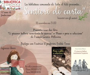 Secondo appuntamento di “Sentieri di carta” il 18 novembre alle 21 alla Biblioteca comunale di Isola con la presentazione dei libri “Ci piaceva ballare nonostante la guerra” e “Pane e pere a colazione”di Franca Garessio Pellissero, che dialogherà con il prof. Erildo Ferro. L’autrice, grande appassionata di storia locale, già autrice di importanti libri sul territorio monferrino è nata a Cinaglio, si è laureata in Lettere all’Università degli Studi di Torino e ha insegnato in diversi ordini di scuole. Nel primo libro che presenterà, si narrano le vicende di Livia che riunisce i suoi vecchi compagni di scuola per festeggiare la fine dell’anno nella sua casa di campagna tra il silenzio delle colline che li videro protagonisti trent’anni prima. La magia del luogo fa scattare i ricordi di quel periodo a cavallo della Seconda Guerra mondiale quando, nonostante tutto, i giovani amavano ballare con la speranza del futuro nel cuore. Dal brutale assassinio di un capitano britannico che portava un bottino di dollari alla causa partigiana sarà l’occasione per ricordare un importante evento avvenuto a Cinaglio nel lontano 1988, a 24 anni dalla caduta nei boschi di Cinaglio del capitano alleato inglese John Keany, episodio che occupa una sezione del romanzo.