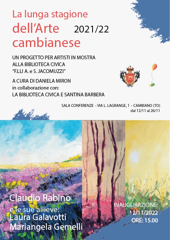 Mostra a Cambiano, presso la Sala conferenze della Biblioteca civica, via Lagrange 1. Espone il maestro Claudio Rabino con le sue allieve, Laura Galavotti e Mariangela Gemelli. La mostra sarà visitabile fino al 26 novembre, in orario apertura della Biblioteca. Inaugurazione sabato 12 novembre alle ore15,00 . E’ la decima, conclusiva mostra della rassegna anno 2022.